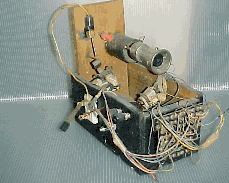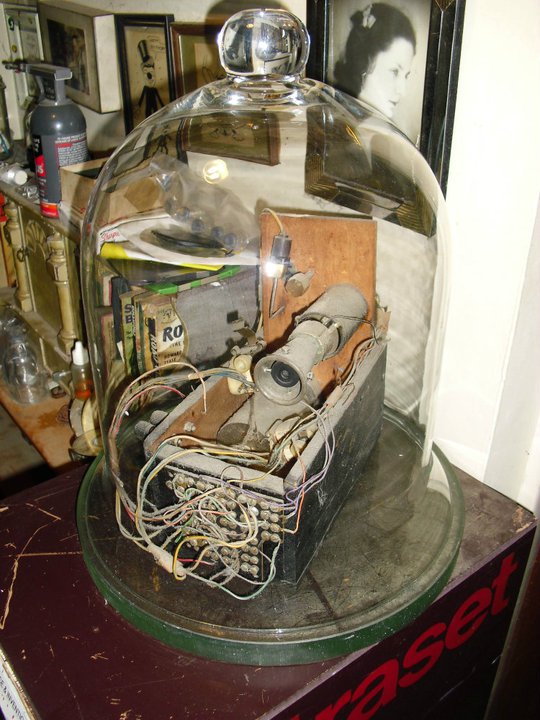 In the thirty years since its discovery no one has been able to fully delve the purpose of this mysterious apparatus. Soon after it was found it was discovered that a, six volt DC current introduced across the terminals would cause the transparent roller to shift back and forth at random and a tiny corona discharge would form between two needle sharp points below and to the left of an eight sided prism of unknown purpose. A high static charge would build around a metal stud which protruded through the case right next to the knife switch which activated the mechanism. After a few years, even these cryptic functions ceased. The device is now, apparently, broken.